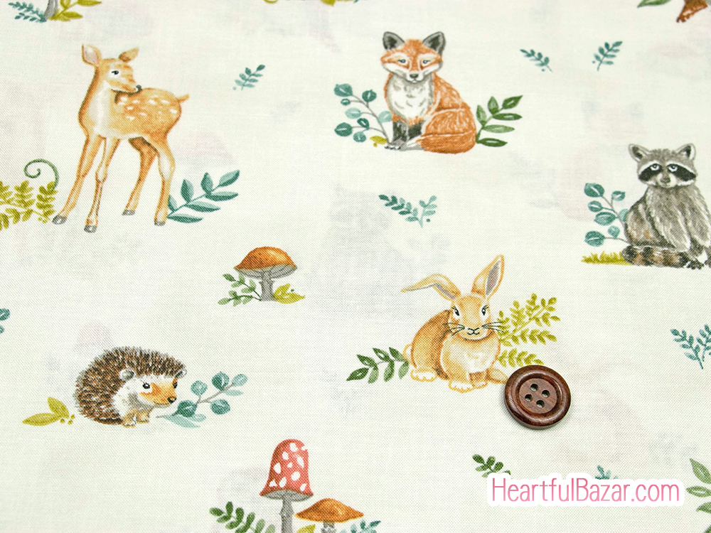 ムラのあるうすーいベージュ地にカメラ目線(?)のうさぎ、きつね、あらいぐま、ふくろう、はりねずみ、小鹿といったかわいい動物たちが描かれています。