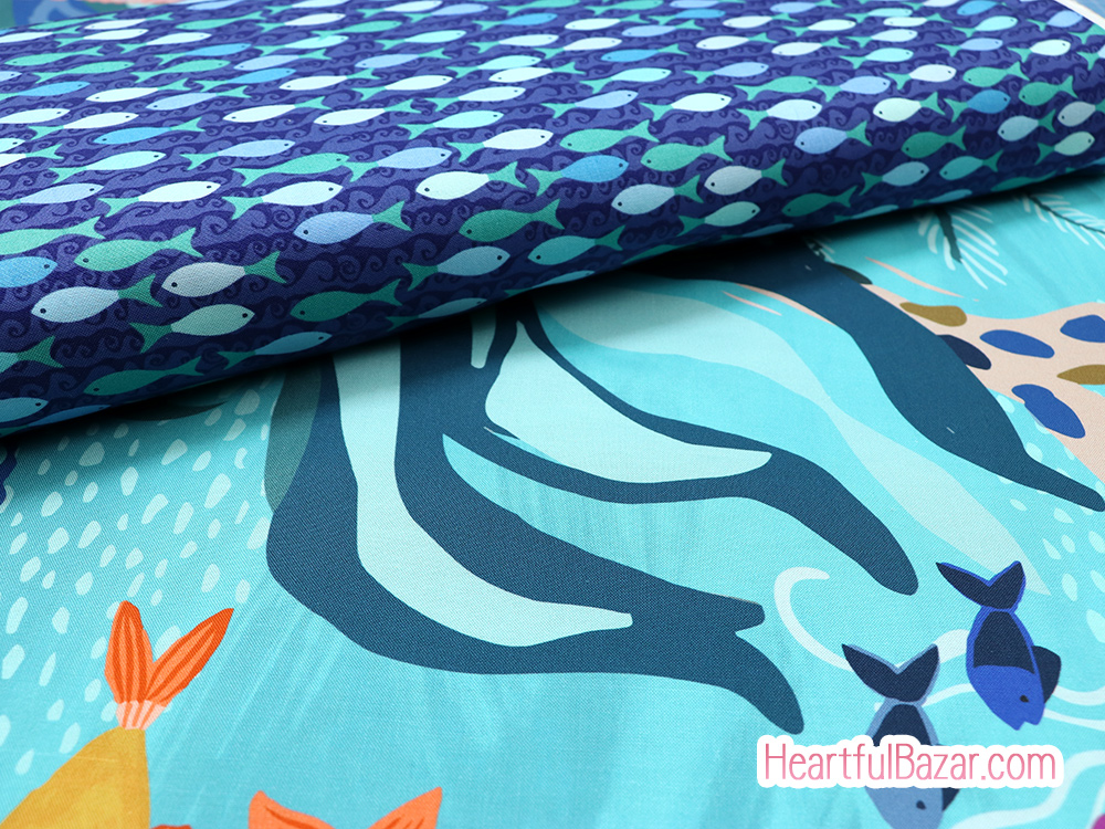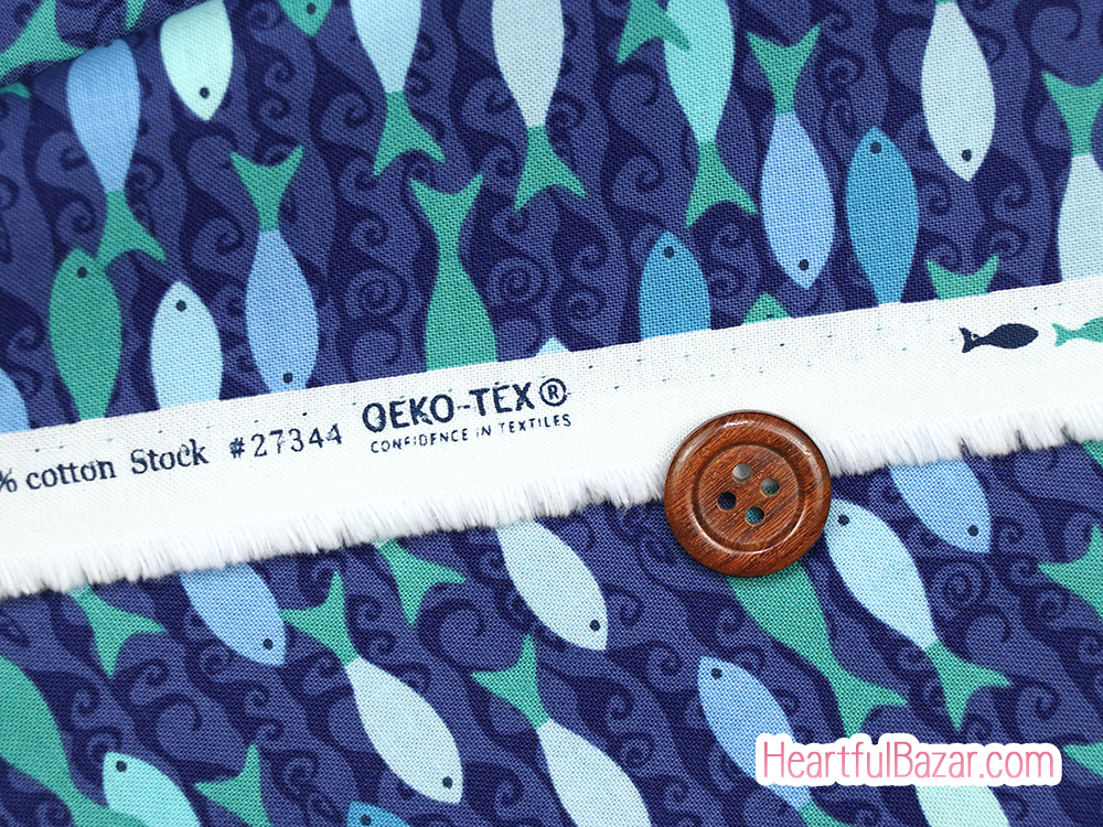 ネイビー地に波模様が描かれた水の中をさかなたちが泳ぐシンプルでかわいいプリントです。