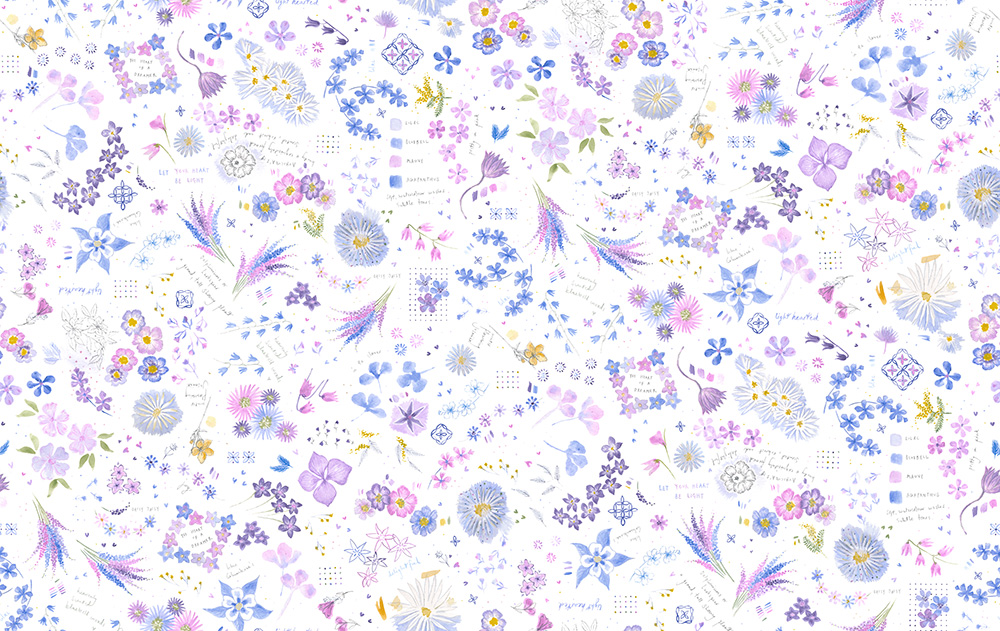 ブルーとパープルを基調とした花々が、美しい水彩で描かれています。