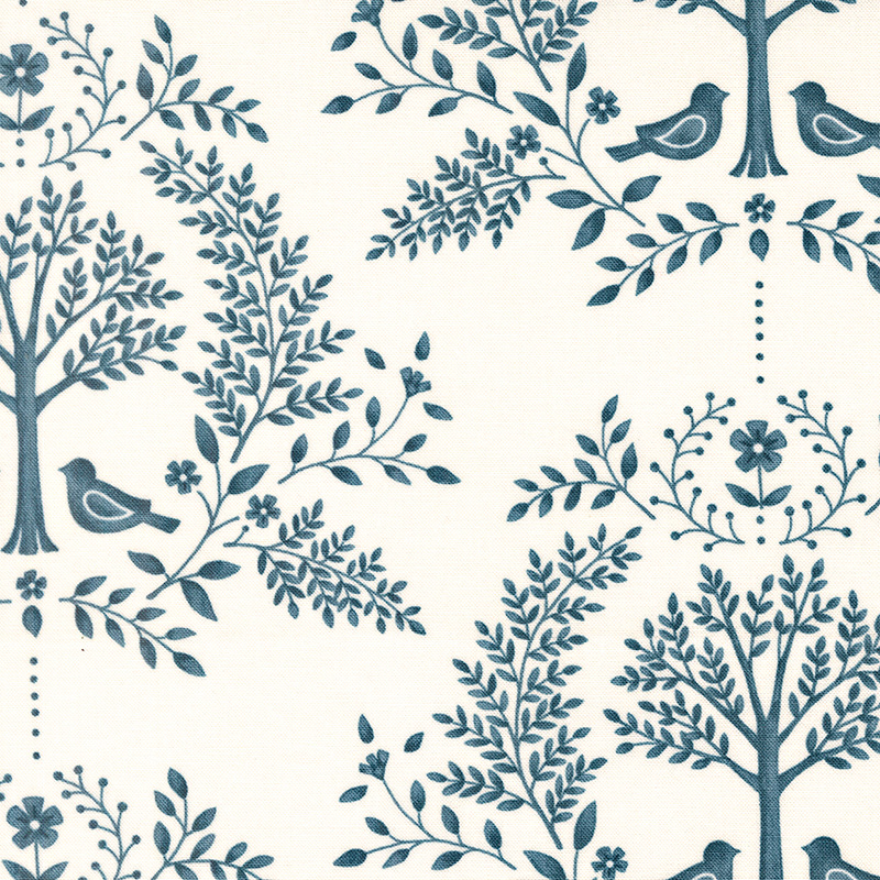 薄いクリーム地に、紺色の木の枝と小鳥、かわいい花がダマスク調で描かれたシンプルで美しいプリントです。