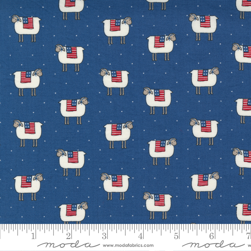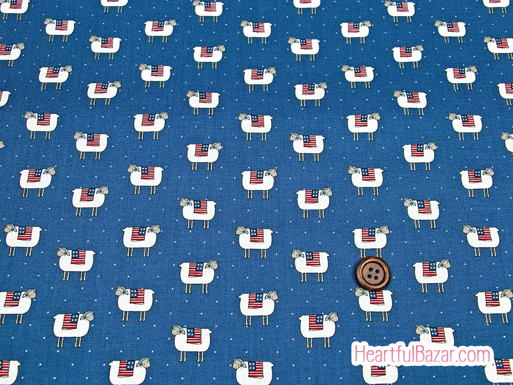 彩度を抑えた青地にピンドット、星条旗を背負ったヒツジがかわいい柄です。