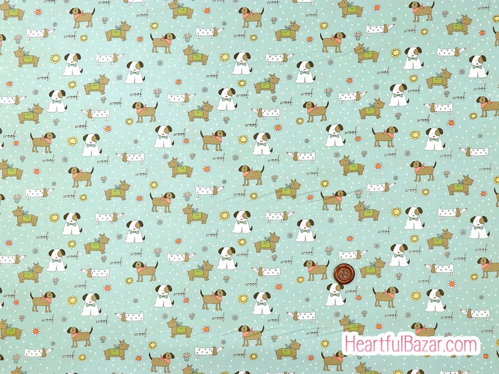 グレー味のあるスカイ地にかわいい子犬たちとちっちゃな花が描かれた、ほっこり系のプリントです。