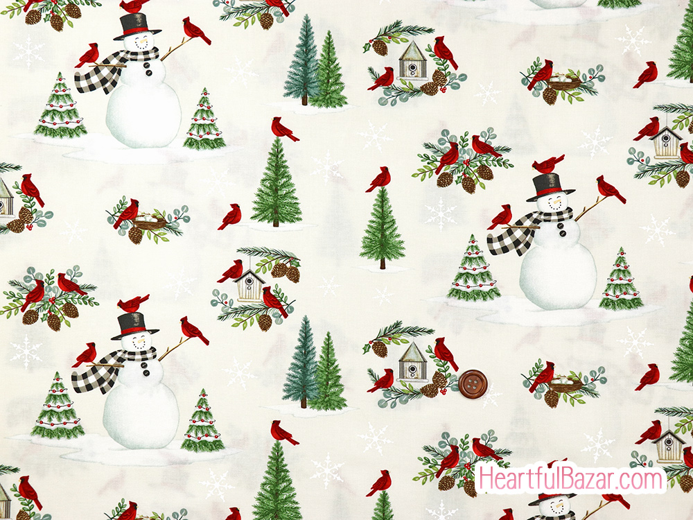 ごく薄いベージュ地にスノーマンと真っ赤なカーディナルがかわいいプリントです。