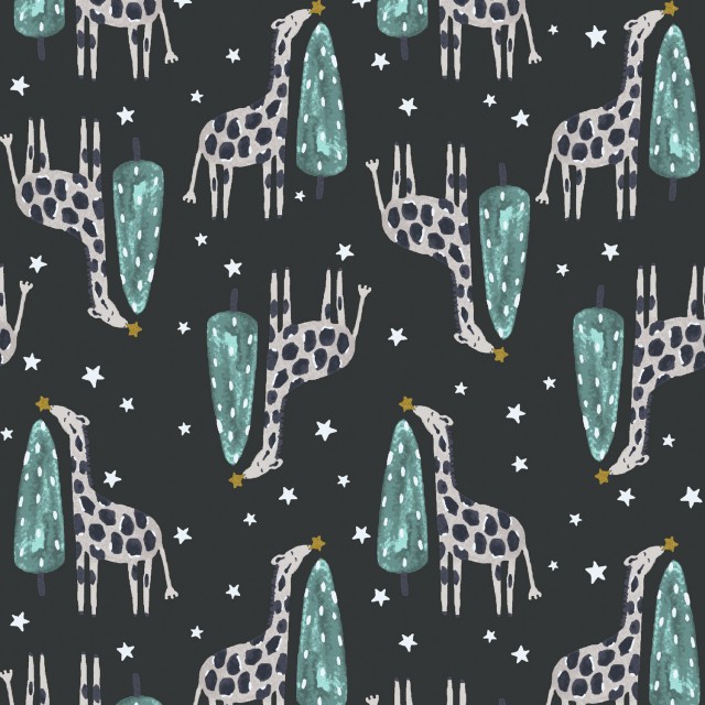 かわいい表情のキリンが木の上に星を捧げているようなデザイン。
