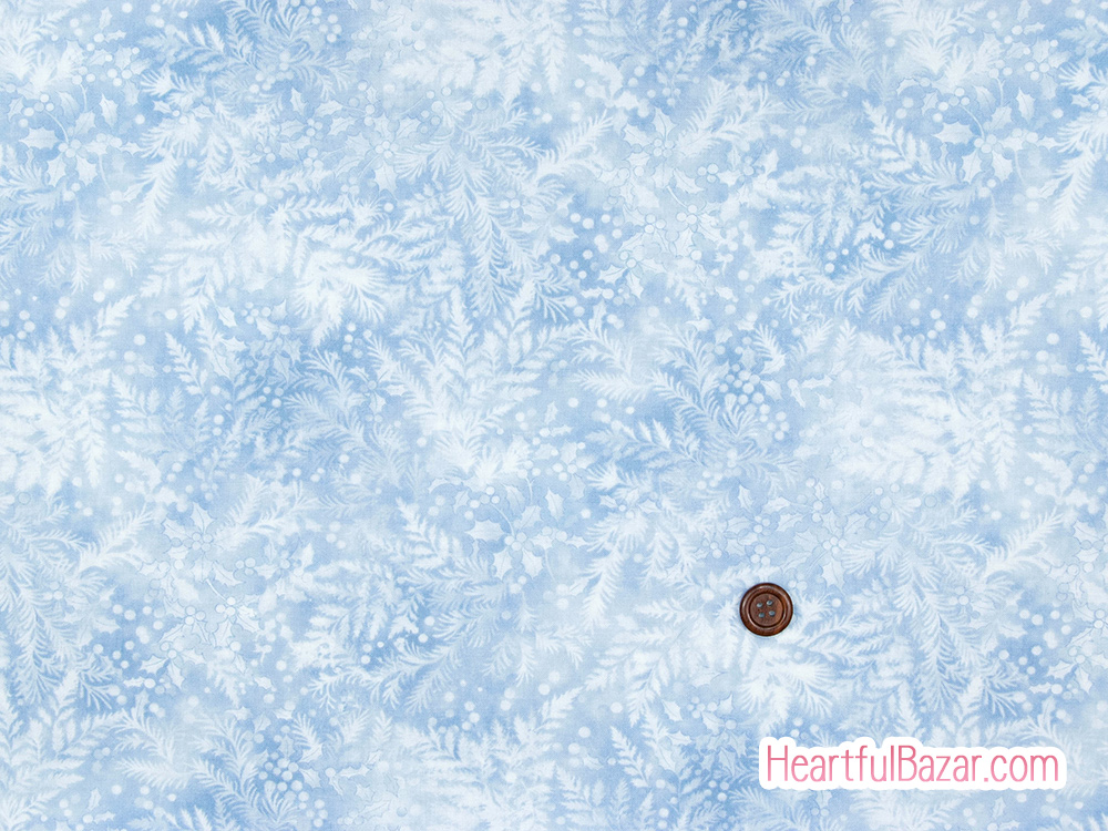 濃淡のあるライトブルー地にさまざまな葉っぱが描かれています。