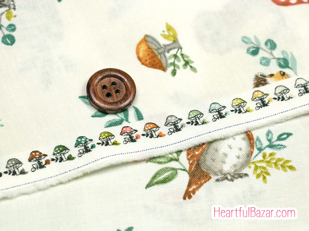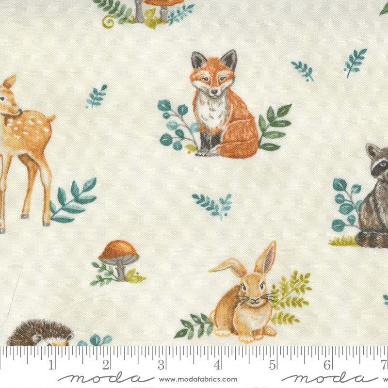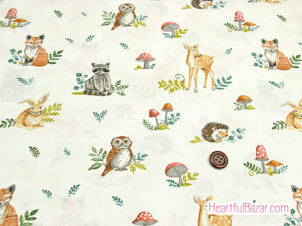 ムラのあるうすーいベージュ地にカメラ目線(?)のうさぎ、きつね、あらいぐま、ふくろう、はりねずみ、小鹿といったかわいい動物たちが描かれています。