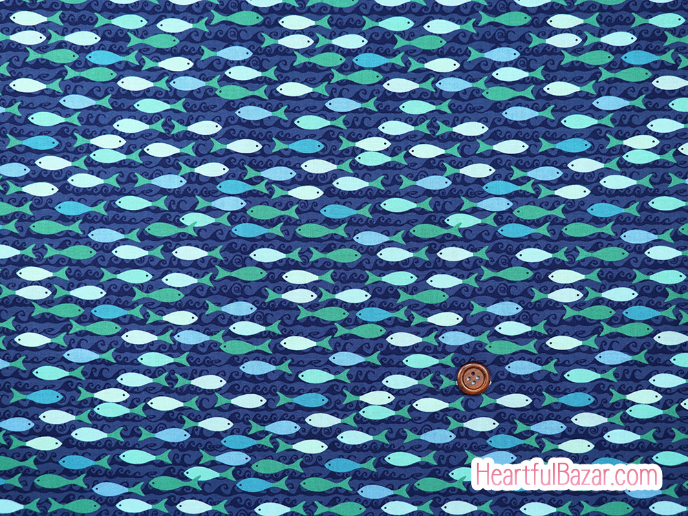 ネイビー地に波模様が描かれた水の中をさかなたちが泳ぐシンプルでかわいいプリントです。