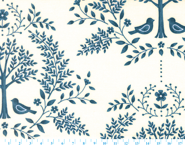 薄いクリーム地に、紺色の木の枝と小鳥、かわいい花がダマスク調で描かれたシンプルで美しいプリントです。