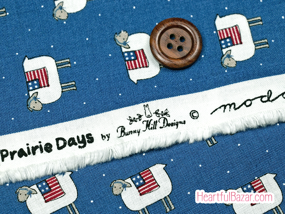 彩度を抑えた青地にピンドット、星条旗を背負ったヒツジがかわいい柄です。