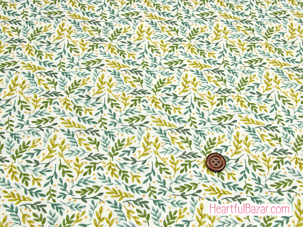 ムラのあるうすーいベージュ地に、さまざまな緑色の葉っぱが一面に描かれています。
